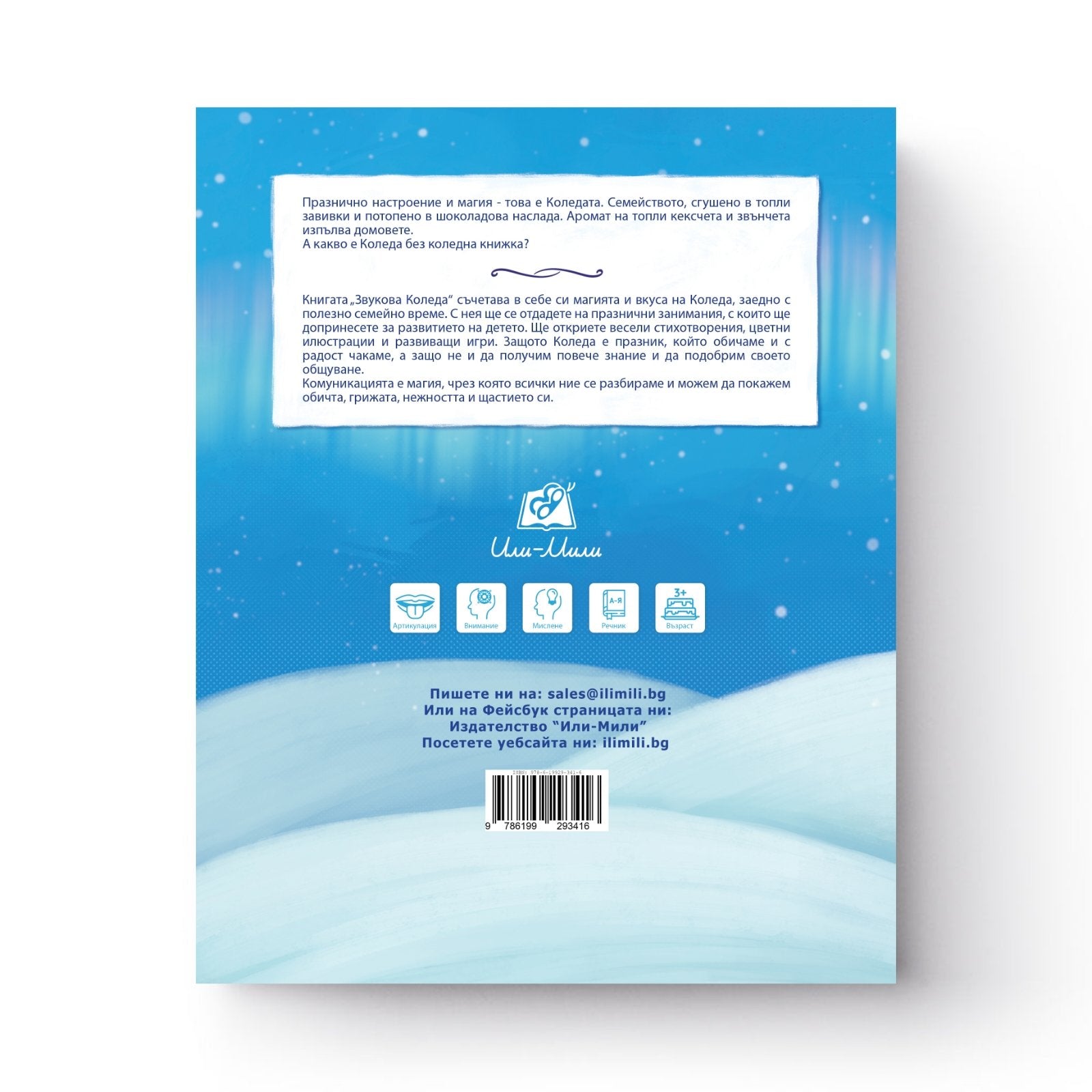 Книгата „Звукова Коледа“ съчетава в себе си магията и вкуса на Коледа, заедно с полезно семейно време. С нея ще се отдадете на празнични занимания, с които ще допринесете за развитието на детето. Ще откриете весели стихотворения, цветни илюстрации и развиващи игри. Защото Коледа е празник, който обичаме и с радост чакаме — а защо не и да получим повече знание и да подобрим своето общуване. Комуникацията е магия, чрез която всички ние се разбираме и можем да покажем обичта, грижата, нежността и щастието си.